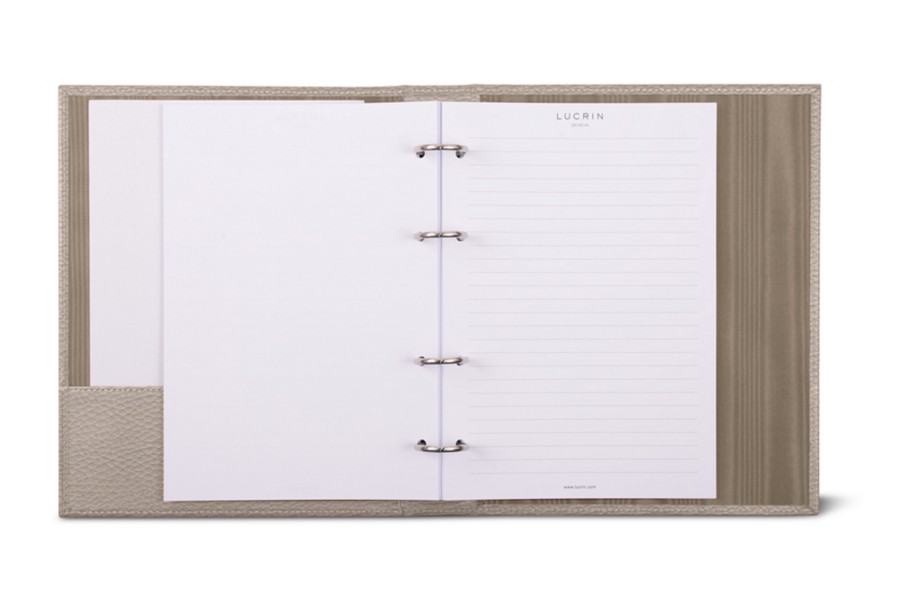 Dieser A5-Ringordner aus Leder mit 4 vernickelten Ringen und einem Volumen von ungefähr 100 Blättern gehört zu den Favoriten von Geschäftsleuten. Die erlesene Verarbeitung und das echte Premium-Leder machen diesen Luxusbüroartikel zu einem Must-have, wenn Sie gut sortierte Unterlagen mit einem Hauch Eleganz zu schätzen wissen. Er besitzt auch ein flaches Fach (18 x 6,5 cm) auf der linken Seite des steifen A5-Büroordners – Sie können zusätzliche Blätter oder kleine Dokumente darin unterbringen.