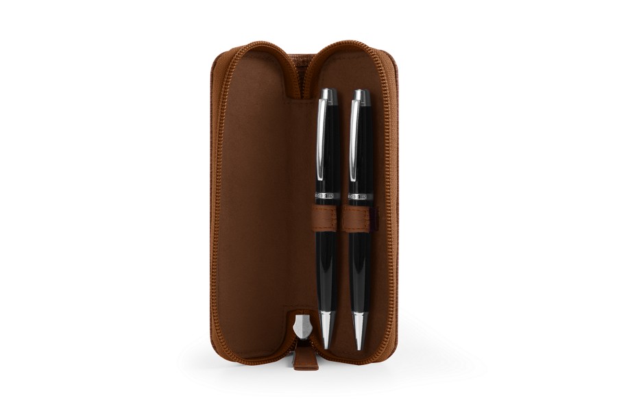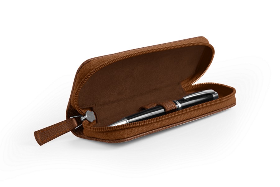 Täschchen für 2 Füllfederhalter mit Reißverschluss - Cognac - Genarbtes Leder
