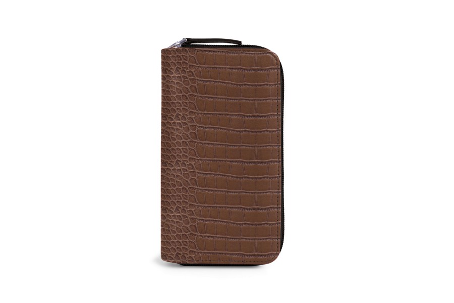 Täschchen für 3 Füllfederhalter mit Reißverschluss - Dunkelbraun - Leder in Krokodil- Optik