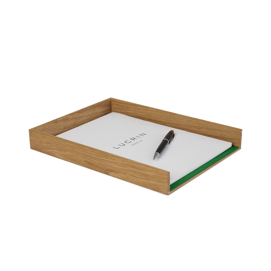 Schaffen Sie einen edlen Arbeitsplatz mit einem natürlichen Touch. Diese robuste, luxuriöse Papierablage ist aus feinstem Holz gefertigt und mit luxuriösen Lederakzenten versehen, die für dauerhafte Qualität sorgen. Das schlichte Design dieser A4-Papierablage sieht auf Ihrem Schreibtisch elegant aus und bietet gleichzeitig Funktionen, um Ihre Dokumente geordnet und an ihrem Platz zu halten. Die Ablage dient als Schreibtisch-Organizer und verstaut alle Dokumente und wichtigen Ordner. Die Papierablagen von LUCRIN lassen sich mit unserer Auswahl und leuchtenden Farben sowie eleganten Gravuroptionen ganz einfach personalisieren.