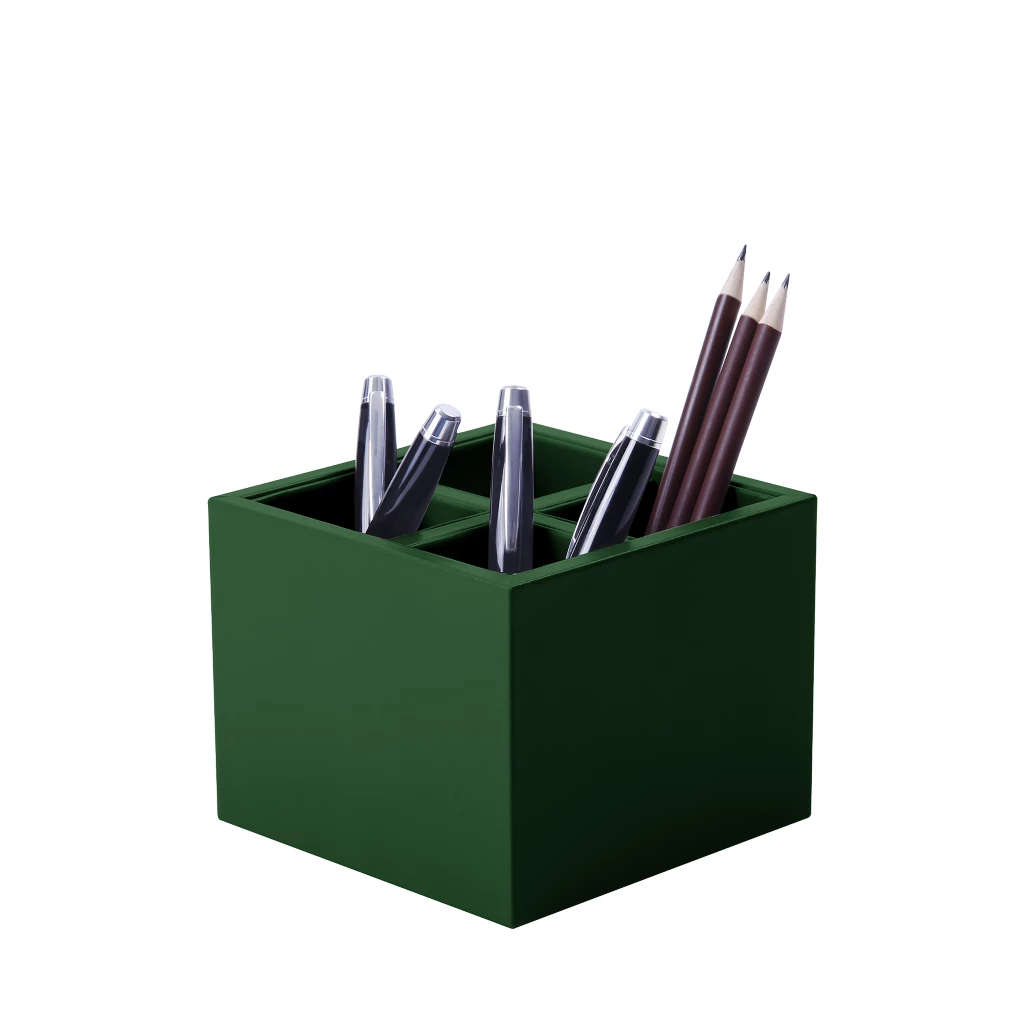 Entdecken Sie unseren großen Stiftbehälter für all jene, die einen ordentlichen und stilvollen Arbeitsplatz besonders wertschätzen. Dieser große Stiftbehälter wurde von unseren Kunsthandwerkern aus einem massiven Holzsockel handgefertigt und mit hochwertigem Leder ummantelt. Er ist in 4 Fächer unterteilt, damit Sie Ihre Schreibgeräte und andere Schreibwaren besser sortieren können. Personalisieren Sie die Farbe Ihres Stiftbechers, damit er perfekt zu Ihrem Arbeitsplatz passt.