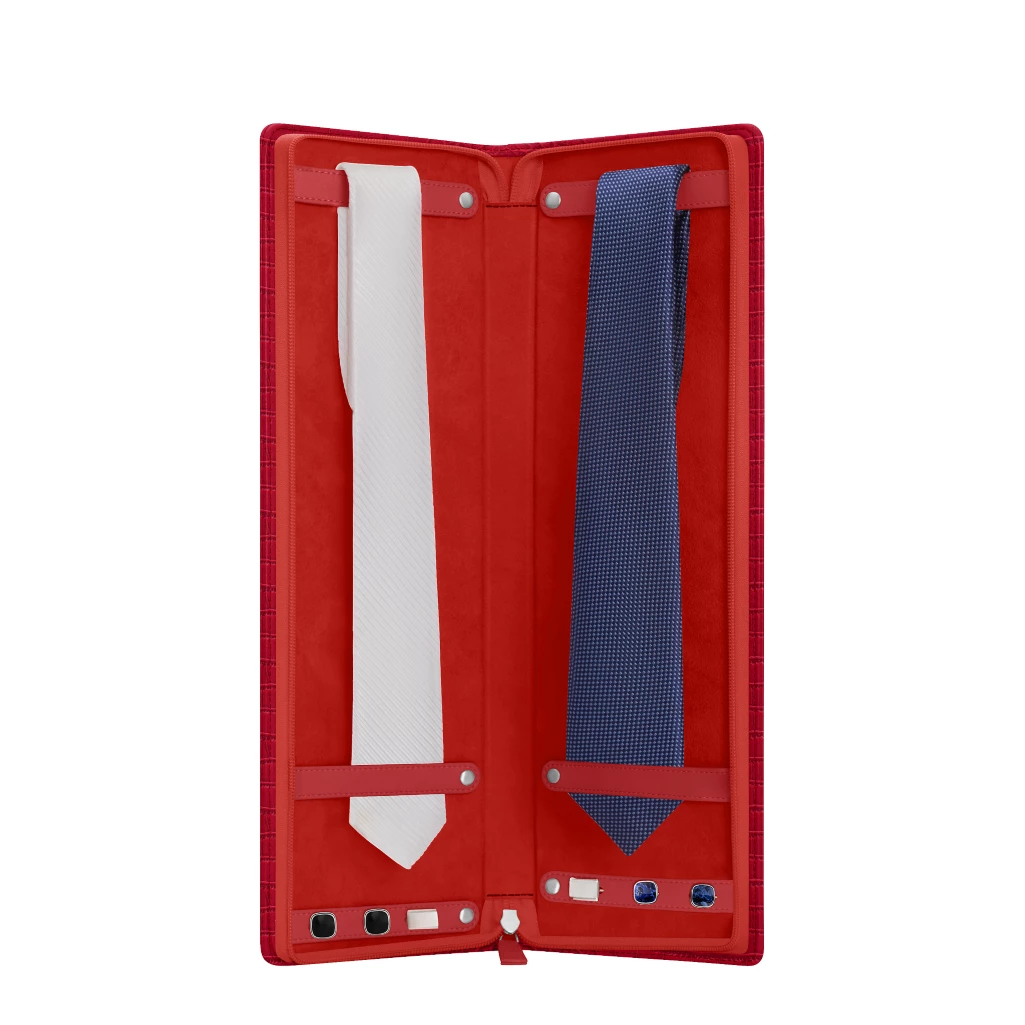Elegant und praktisch schützt diese Krawattenmappe aus Leder perfekt Ihre Krawatten und Manschettenknöpfe auf Reisen. Als absoluter Bestseller, insbesondere bei jenen, die viel unterwegs sind, lässt sich diese Krawattenaufbewahrung aus Leder mit einem Reißverschluss verschließen und dient zur Unterbringung von bis zu 2 Krawatten (1 auf jeder Seite), die von 2 Schlaufen mit Druckknopfverschluss gehalten werden. Zwei funktionale Lederbänder mit Schlitzen dienen außerdem der Aufbewahrung von bis zu 3 Paar Manschettenknöpfen.