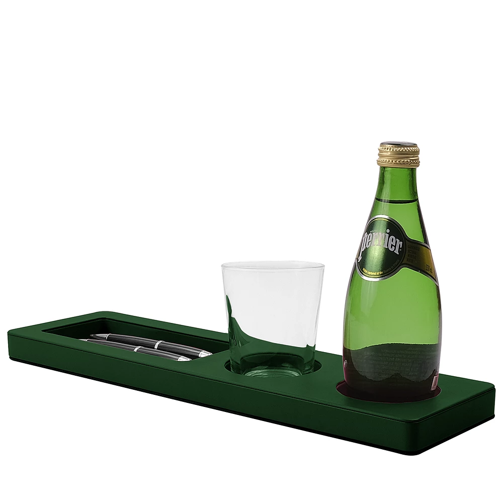 Die Homeoffice-Schreibtischablage aus Holz mit echtem Lederbezug eignet sich ideal, um Ihre Flasche, Ihr Glas und Ihre Utensilien wie Stifte, Büroklammern und vieles mehr ordentlich und elegant zu verstauen. Stellen Sie diese edle Schreibtischablage auf Ihren Arbeitstisch und verleihen Sie Ihrem Arbeitszimmer einen luxuriösen Touch. Ordentlich und elegant. Nutzen Sie die zwei runden Aussparungen (Durchmesser 7,5 cm & Tiefe 1,5 cm) für eine kleine Flasche oder ein Glas. Die rechteckige Aussparung (17 x 7,5 x 1,5 cm) eignet sich ideal, um Stifte, Büroklammern und andere kleine Utensilien, die Sie regelmäßig verwenden, aufzubewahren. Diese erlesene Schreibtischablage aus Leder kann in der Farbe und Lederart personalisiert werden, die am besten zu Ihrer Inneneinrichtung passen.