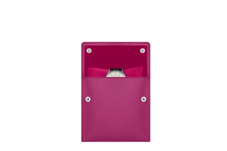 Quadratisches weiches Uhrenetui mit einem Uhrenkissen. Klappverschluss mit zwei Druckknöpfen. Ausführung in Lammleder.