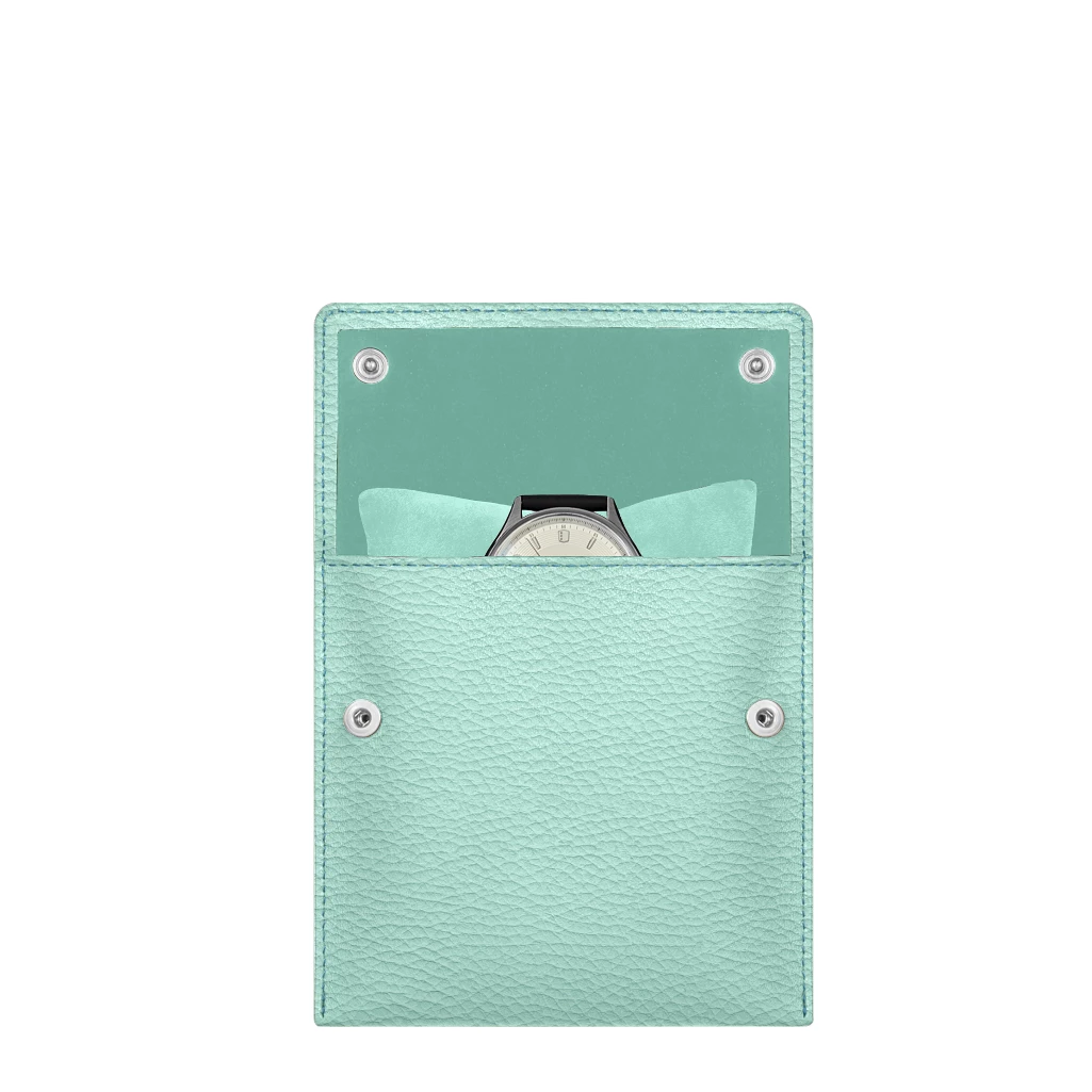 Quadratisches weiches Uhrenetui mit einem Uhrenkissen. Klappverschluss mit zwei Druckknöpfen. Ausführung in Lammleder.