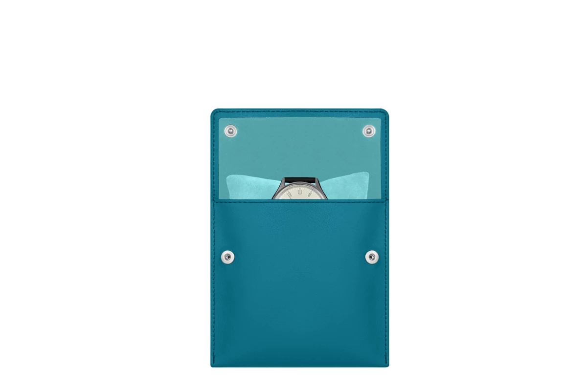 Quadratisches weiches Uhrenetui mit einem Uhrenkissen. Klappverschluss mit zwei Druckknöpfen. Ausführung in Lammleder.