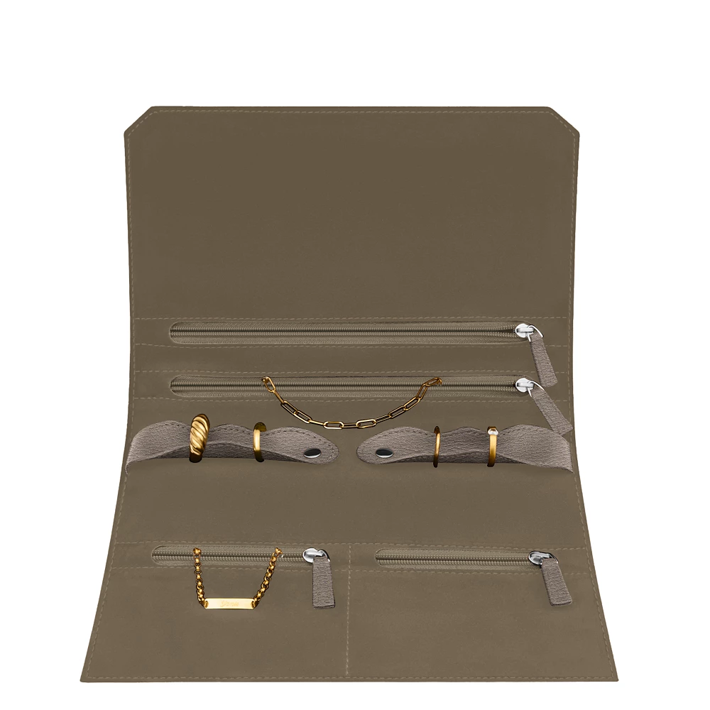 Hören Sie auf, Ihre liebsten Schmuckstücke und Accessoires zu verlieren und verstauen Sie sie sicher im neuen Schmucketui aus Leder zum Einrollen von Lucrin. Mit speziellen Fächern für Ihre Ketten, Ohrringe und sogar Uhren ermöglicht dieses Etui Ihnen eine absolute Platzoptimierung in Ihrem Gepäck oder Ihrer Handtasche. Vier Fächer wurden für eine perfekte Ordnung speziell designt. Auch Ihre Ringe finden dank der zwei mit Druckknöpfen befestigten Riemen optimal Platz. Die Innenseite aus Mikrofaser schützt Ihre Wertsachen vor Kratzern und Staub. Zu guter Letzt verschließt eine Lederschnur alles sicher, so dass nichts verloren geht.
