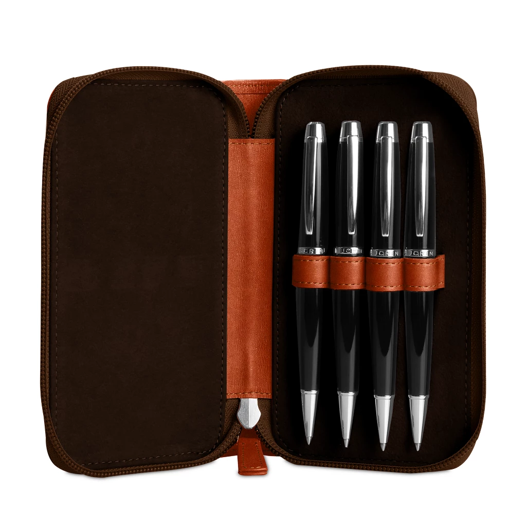 Etui 4 Füllhalter Zippé. Elegantes Täschchen für 4 Füllfederhalter mitReißverschluss. Innenschlaufe zum Befestigen des herausziehbarenFüllfederhalters. Perfekt geeignet für dünne, mittlere und dickeFüllfederhalter.