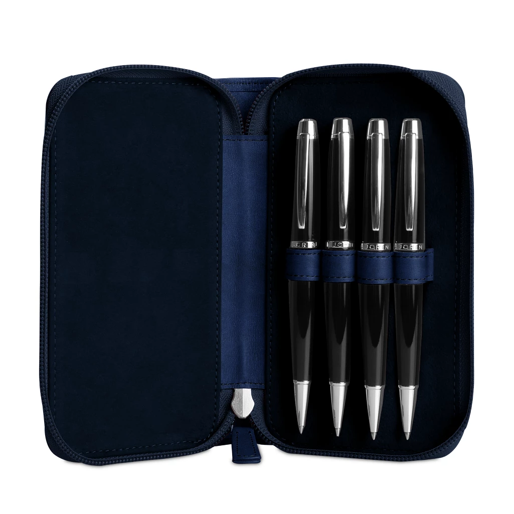 Etui 4 Füllhalter Zippé. Elegantes Täschchen für 4 Füllfederhalter mitReißverschluss. Innenschlaufe zum Befestigen des herausziehbarenFüllfederhalters. Perfekt geeignet für dünne, mittlere und dickeFüllfederhalter.